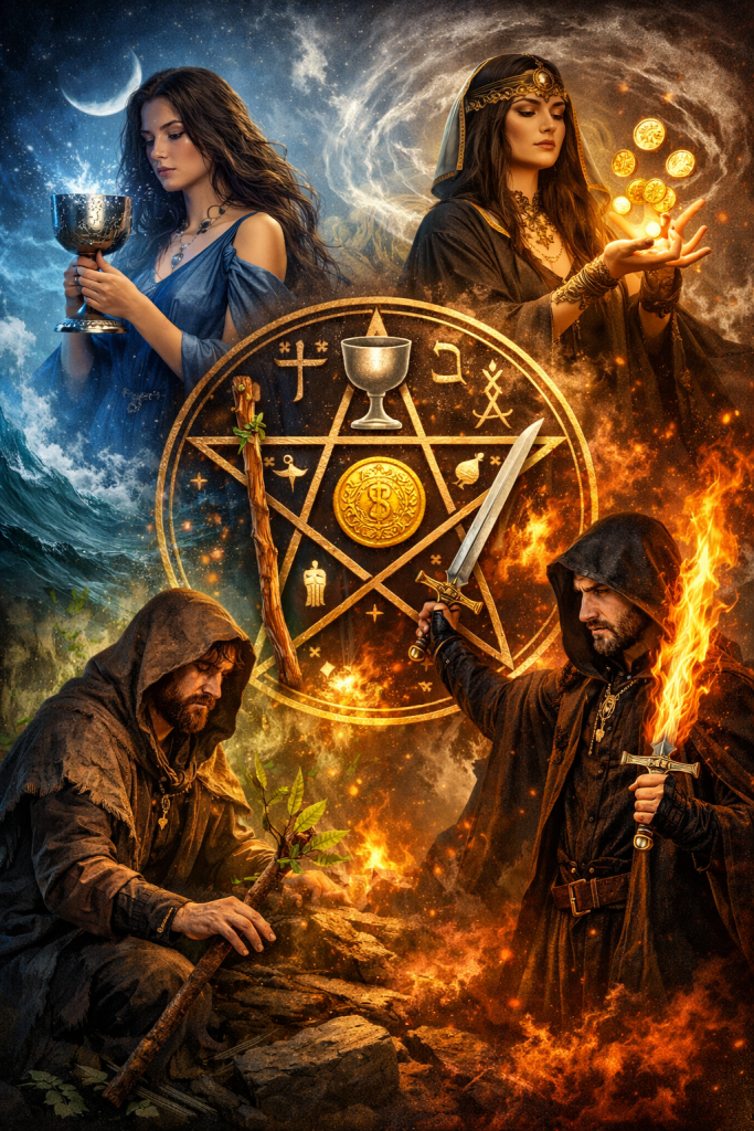 La magia elemental puede entenderse como un sistema simbólico que organiza la experiencia humana en cuatro grandes fuerzas: agua, tierra, aire y fuego.